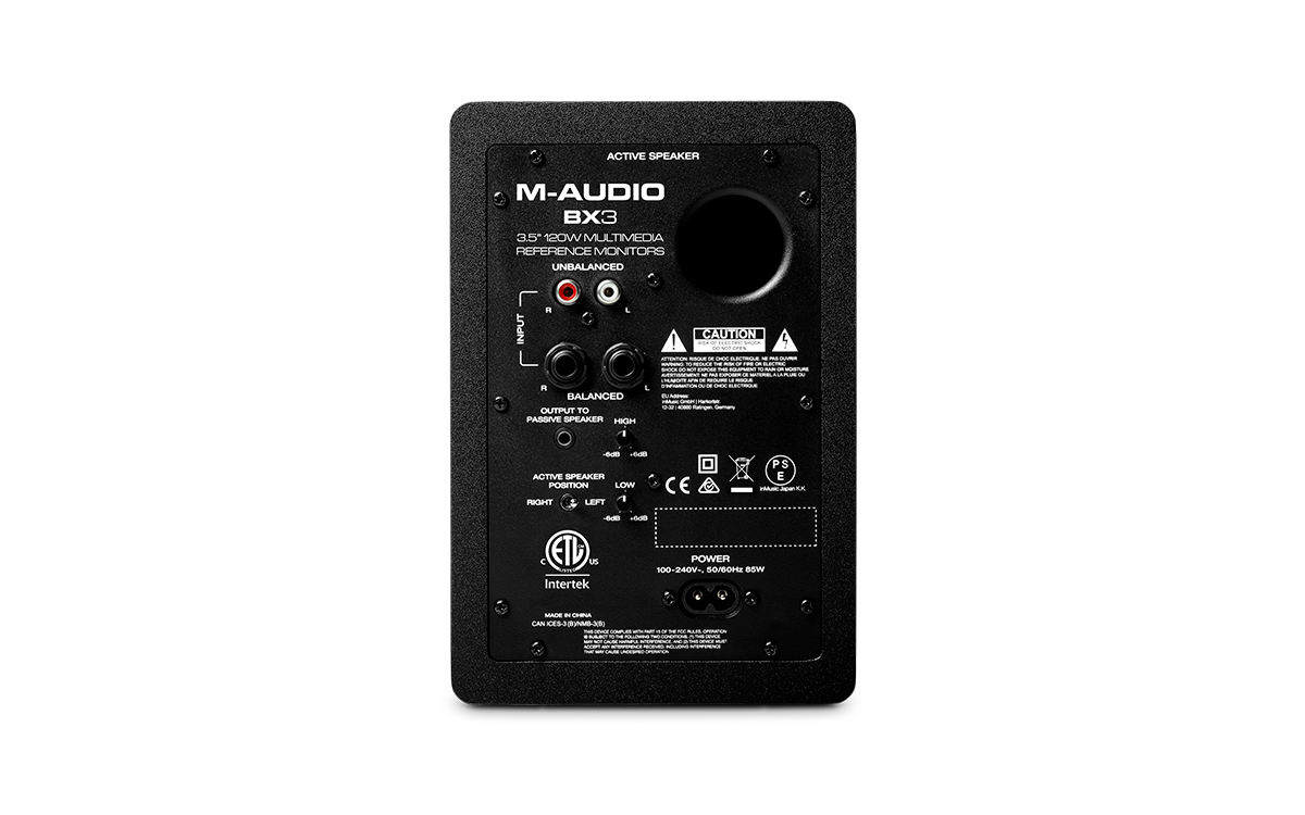 Features that are usually only found on high-end, expensive studio monitors are included on the rear panel of the M-Audio BX3. High-EQ and Low-EQ controls dial in the perfect sound for your environment and let you customize the sound of the BX3. The Left/Right Active Speaker Position Switch lets you choose which speaker is the Left or Right side. This is very useful if you are left-handed and want the speaker with the front panel volume control on your left side. It’s your choice!