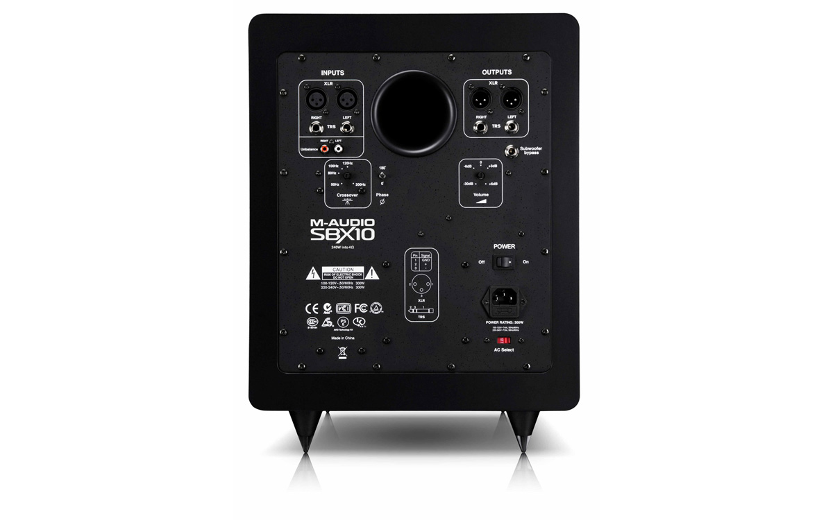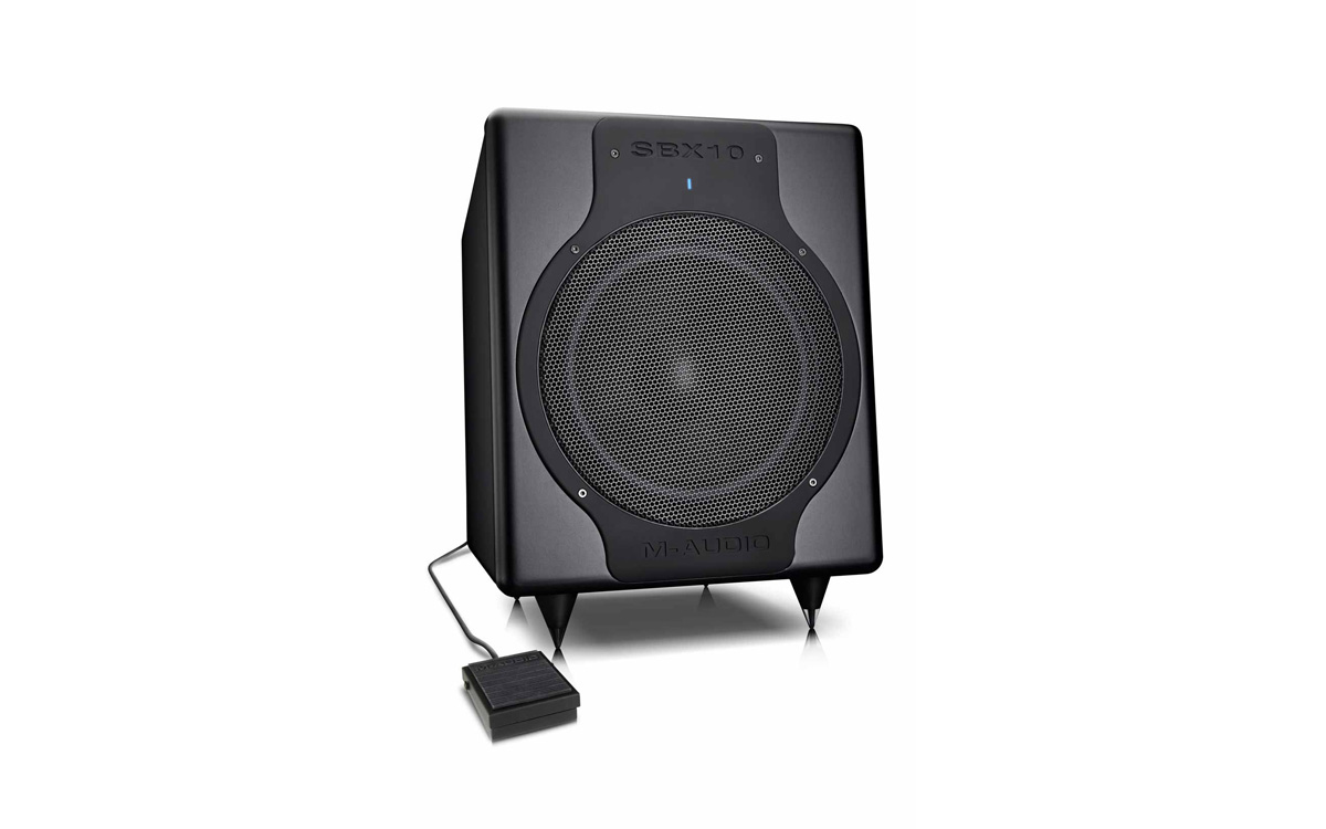The M-Audio® SBX10 active subwoofer is designed to give your monitoring system some serious low end. The SBX10 delivers tight, clean bass response down to 20Hz—revealing the extreme low frequencies in your music so you can make accurate mixing decisions. Comprising a 10” fiberglass/paper composite driver, a 240-watt all-discrete internal amplifier, and a variable 50-200Hz crossover, the SBX10 subwoofer delivers unbeatable performance in a compact chassis—great for studios where space is tight. An oversized magnet, high-temperature voice coil, high-density cabinet and a full complement of inputs are just some of the additional components that round out this high-quality design. The unit even includes a bypass footswitch so you can easily judge how mixes will sound with and without a dedicated subwoofer. The SBX10 represents the perfect addition to any studio monitor setup.