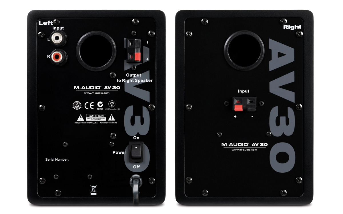 We build the AV 30s with the same quality materials and precision electronics as our acclaimed M-Audio professional studio speakers. The audiophile-grade Class A/B amplifier architecture, ferrofluid-cooled silk cone tweeters, polypropylene-coated woofers, and dense wooden enclosures add up to big, defined sound that defies the speakers' small size.